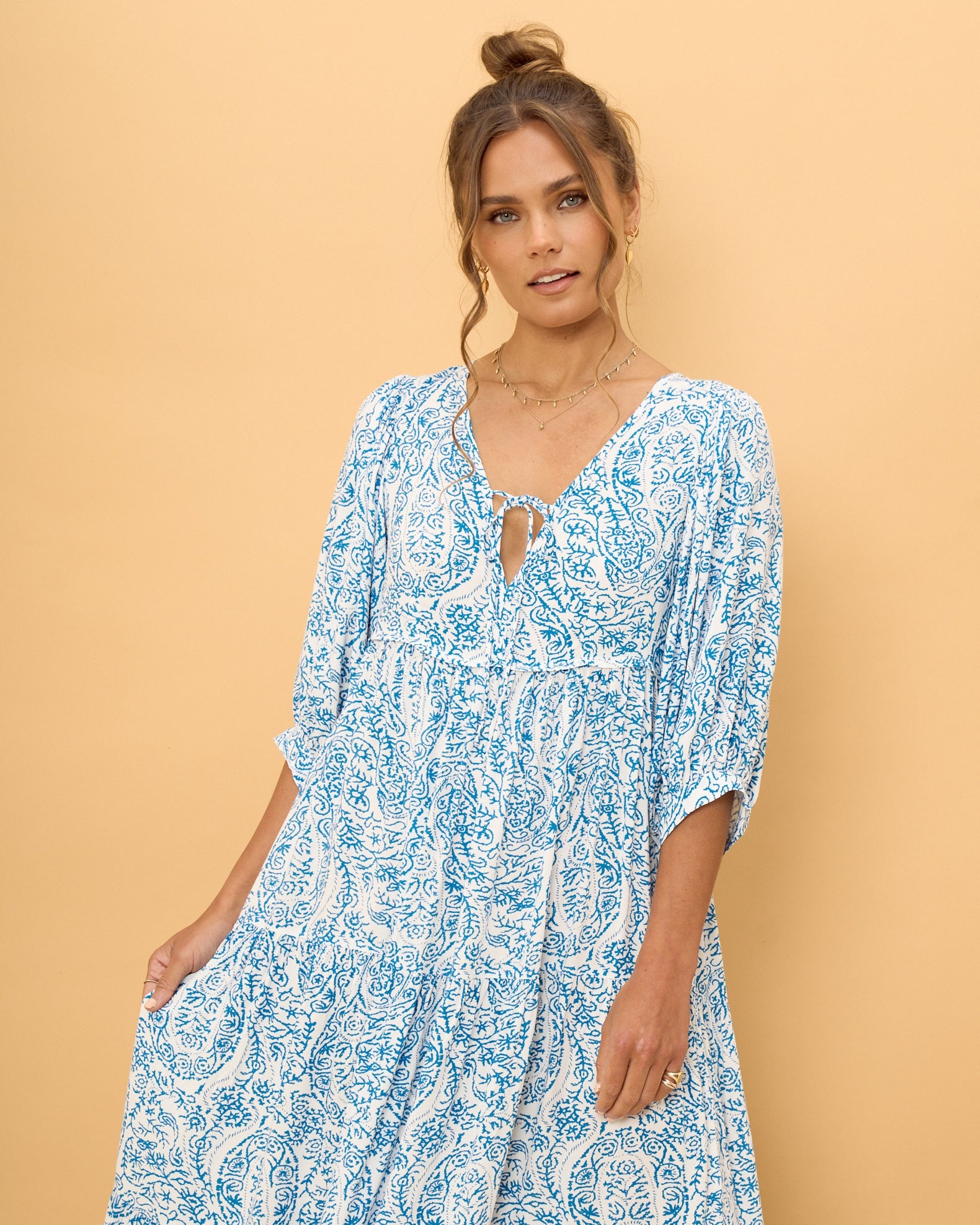- Designed with a lightweight, airy fabric and a relaxed fit, this dress ensures you stay comfortable all day long. Its intricate blue and white print and tiered design create a visually stunning look that's perfect for a variety of occasions.